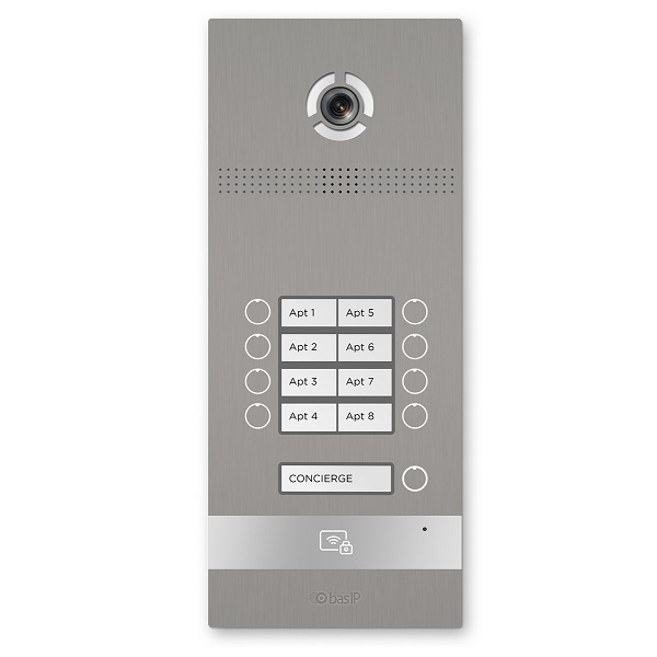 Вызывная панель на 8 абонентов. Поддержка технологии "Ukey": считывание карт и брелоков и мобильных идентификаторов по стандартам EM-Marin, Mifare® Plus и Mifare® Classic, Bluetooth, NFC. Память до 10 000 идентификаторов или карт. Цветная IP камера 1.3 Мп, 1/4” CMOS, угол обзора 120°. Врезной/накладной монтаж. Степень защиты IP65. Температурный режим: -40 до + 65 °C. Пьезоэлектрические кнопки вызова, отдельная кнопка вызова консьержа. Встроенное реле. Питание PoE и +12 В. Поддержка SIP, P2P, Wiegand 26, 32, 34, 37, 40, 42, 56, 58, 64, RS485. Размер: 355×140×53 мм. Цвет - серебро. Гарантия - 5 лет.