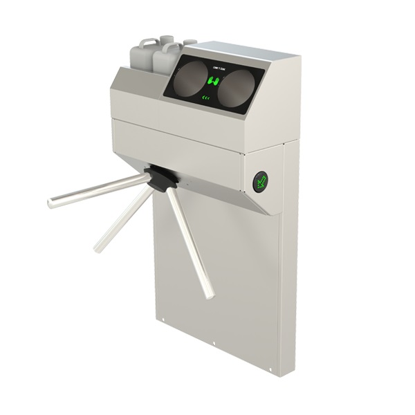 Турникет-трипод электромеханический высокоинтенсивный AVIR 800 со встроенным санитайзером. Корпус и преграды из нержавеющей стали AISI 304. Оснащен платой управления и светодиодными указателями прохода. Стандартные преграждающие планки с гидравлической доводкой и автоматической разблокировкой при отключении электроэнергии. Встроенный блок питания. IP54. Емкость баков 5 + 5 литров. Средний расход антисептика: 1 литр на 110 проходов.