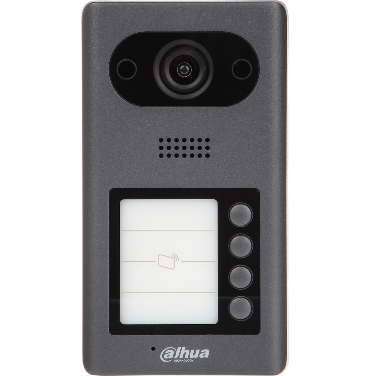 Вызывная панель с разрешением 2мп и CMOS сенсором, угол обзора по горизонтали 134 градуса, алюминевая панель, уровень защиты IP65, IK08. Поддержка режима "Ночь" и голосового оповещения. Групповые вызовы. С четырьмя кнопками. Видео и аудио сообщения. Удаленный доступ через мобильное приложение DMSS. Установка на стену. Питание: DC 12V, PoE(802.3af)
