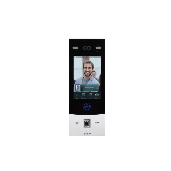 Вызывная панель с разрешением 2мп и CMOS сенсором, емкостный сенсорный IPS экран с диагональю 8 дюймов и разрешением 800*1280, алюминевый корпус,открытие по отпечатку пальца, карте, сканированию лица паролю или Bluetooth ключу. Количество лиц в памяти 20000, время распознавания лица ≤0.3 сек, уровень защиты IP66, IK07. Питание: DC 12V.