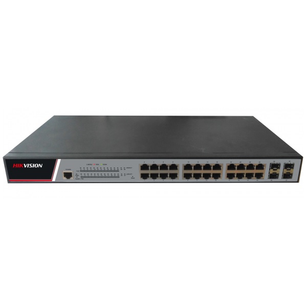 Hikvision DS-3E2528 - управляемый коммутатор, L2. 24 порта 10/100/1000Base-T,4 порта SFP 1000Base-X, 1 консольный порт. VLAN, RSTP, IGMP, QoS, ERPS.