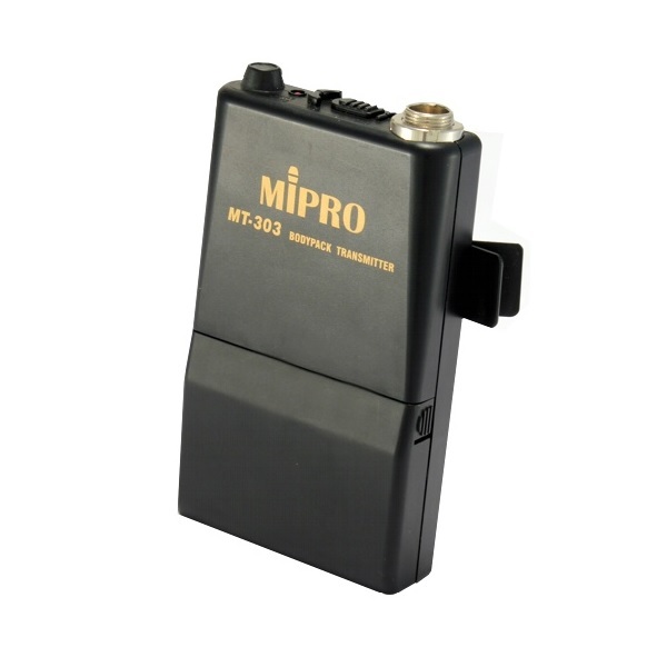 В верхней части микрофонного радиопередатчика MT-303 расположен 4-контактный разъём типа мини-XLR для подключения источника сигнала — петличного микрофона, головного микрофона или электроакустической гитары — и индикатор разрядки батареи. Под откидной крышкой расположен 16-позиционный переключатель частотного канала, настраиваемого для передачи сигнала, и двухпозиционный переключатель входного сопротивления, изменяемого в зависимости от используемого источника сигнала — электроакустической гитары или микрофона. Микрофонный радиопередатчик используется в паре с ресивером серии MR.