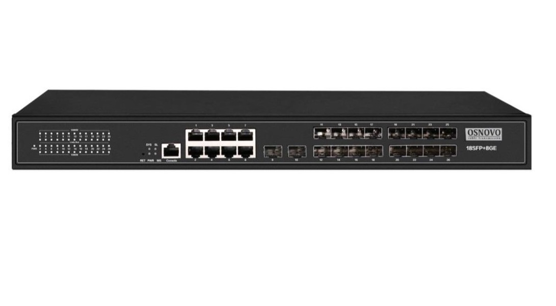 Управляемый L2+ коммутатор Gigabit Ethernet на 18 x GE SFP + 8 x GE RJ45 портов. Порты: 18 x GE SFP (1000 Base-X), 8 x GE (10/100/1000 Base-T). Консольный порт, Уровень управления L2 (Full managed), Поддержка Jumbo Frame 16K, IGMP Snooping, Монтаж в 19" стойку, крепление в комплекте. Питание: AC100-240V(35W) Встроенный БП - 2шт. Резервирование питания. Размеры (ШхВхГ): 440 x 45 x 210мм. Рабочая температура: 0...+50 гр. С.