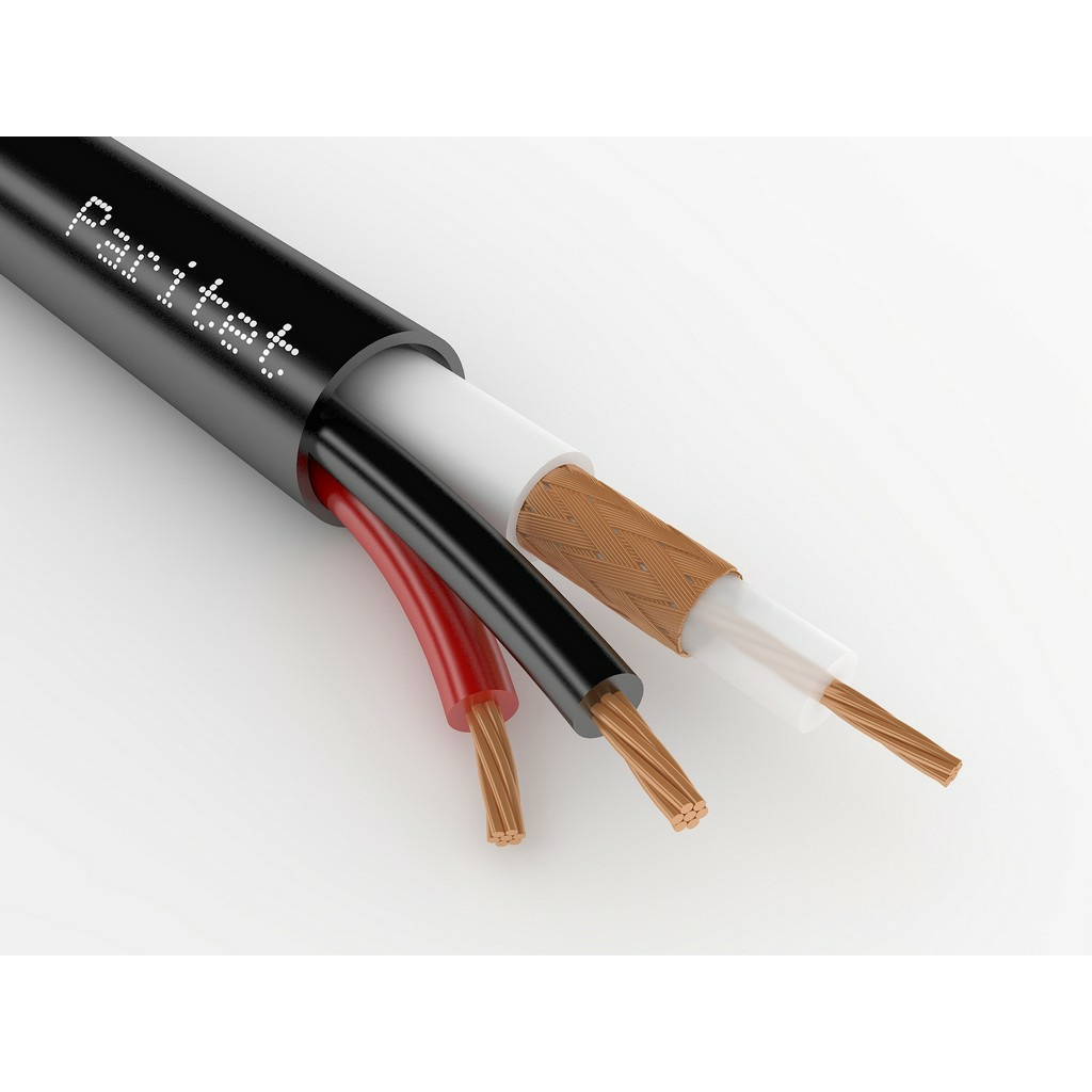 Комбинированный кабель Паритет КВК-П-1,5ф 2х0,5 (черный)(200м) для систем аналогового видеонаблюдения имеет однопроволочный радиочастотный элемент РК 75-1,5-36, экран (оплётка медными проволоками плотностью не менее 90%) и две жилы питания сечением 0,5 мм.кв. Предназначен для внешней стационарной прокладки.