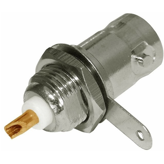 PROCONNECT Разъем гнездо BNC на корпус предназначен для подключения коаксиального кабеля c волновым сопротивлением 50 или 75 Ом к видеокамерам, видеорегистраторам, мониторам и другим радиоэлектронным устройствам. BNC-гнездо (BNC сокр. от Bayonet Neill Concelman) на корпус - электрический разъем с байонетной фиксацией соединяется с кабелем с помощью пайки. Соединение такого типа позволит передать сигнал с минимальным уровнем потерь между проводниками кабеля и гнездом, создавая наиболее качественный контакт. Гнездо монтируется на корпус прибора и надежно фиксируется гайкой.