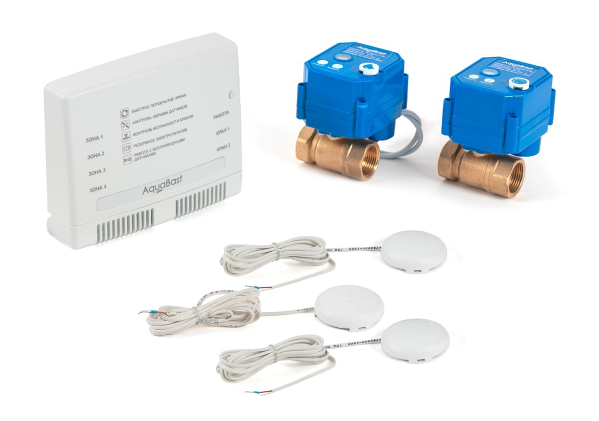 В комплект входит: Модуль управления системы AquaBast. 2 шаровых крана 3/4" с электроприводом, 12 В. 4 Датчика протечки. Контроль датчиков протечки и ...