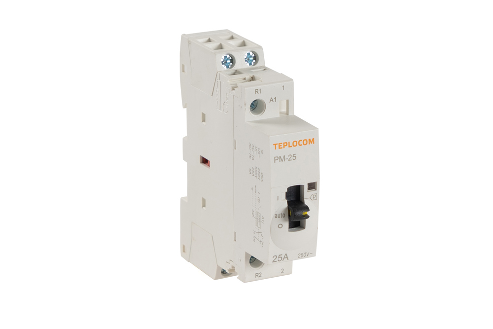 Релейный модуль 250 В, 25 А. Релейный модуль предназначен для управления мощными нагрузками (насосы отопления/водоснабжения любого типа, тёплые полы, электрические котлы, нагревательные, осветительные приборы и т. д.) по сигналу от контроллеров автоматического управления. Номинальный ток — 25 А. Коммутируемая мощность — 5.5 КВт. Стандартный корпус на DIN-рейку, ширина — 1U. Диапазон рабочих температур окружающего воздуха — от -5 до 60 °C. TEPLOCOM РМ-25 совместим с оборудованием производства Бастион: теплоконтроллерами серии TEPLOCOM TC, термостатами серии TEPLOCOM TS, TSF, устройствами защиты от протечки AquaBast, теплоинформаторами серии TEPLOCOM и т. д.