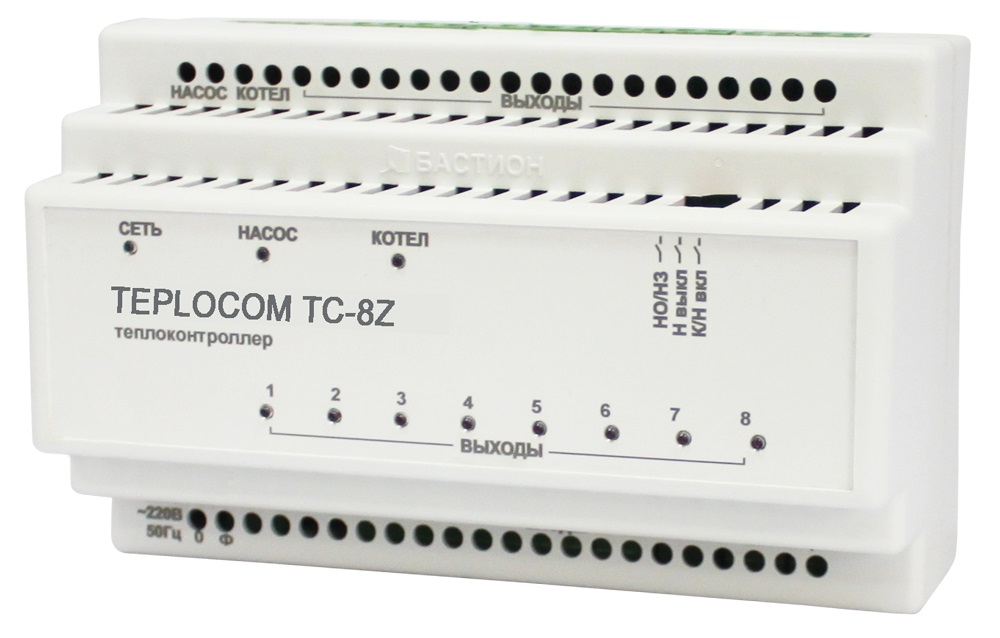 Теплоконтроллер предназначен для управления многоконтурной системой водяного отопления, котлом и циркуляционным насосом по сигналам от комнатных термостатов. Теплоконтроллер обеспечивает поддержание индивидуальной комфортной температуры в каждой комнате вашего дома (8 независимых зон отопления). Встроенная функция управления отопительным котлом и циркуляционным насосом обеспечивает существенную экономию электричества и газа, а также продлевает срок службы котла и насоса. Удобная схема коммутации позволяет легко и быстро осуществить монтаж системы управления. Контроллер работает с любыми термостатами и сервоприводами на 220 В. Настройка задержки включения/выключения насоса и котла обеспечивает корректную работу системы отопления. Количество зон отопления — 8. Ток реле котла — 5 А. Ток выхода на насос — 5 А. Настройка задержки включения котла и насоса, задержки выключения насоса, типа сервоприводов (Н/О, Н/З). Индикация работы сервоприводов, котла и насоса.