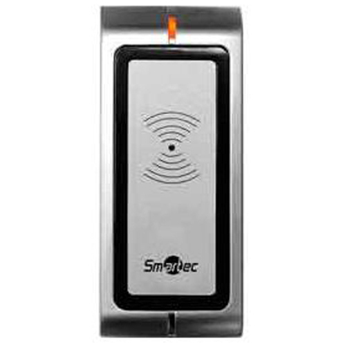 Бесконтактный считыватель Smartec ST-PR040EM, относящийся к бесклавиатурным proximity ридерам, выполняющим прием кода при поднесении к ним карты доступа. Считыватель использует технологию радиочастотной идентификации RFID (Radio Frequency Identification) для приема и распознавания кода карт. Встроенный в proximity считыватель генератор постоянно формирует вокруг устройства электромагнитное поле, при попадании в которое карты Em Marine, в ее антенне наводится переменное напряжение. При этом напряжение тем выше, чем меньше расстояние между proximity ридером и картой, и чем больше размеры антенны, встроенной в идентификатор. Получив энергию, необходимую для работы, карта генерирует ответный радиочастотный сигнал, модулированный ее идентификационным кодом. Для этого в proximity карты встроен миниатюрный чип Em Marine, в состав которого входит передатчик, приемник и процессор. В памяти процессора хранится уникальный ID-код, записанный на карту в заводских условиях. После демодуляции proximity считыватели передают полученный код карты на контроллер СКУД для его сверки с базой данных. Данная модель имеет световую и звуковую индикацию приема кода карт доступа. Когда в зоне своего действия proximity устройство обнаруживает соответствующий Em Marine пропуск, двухцветный светодиод переключается с красного на зеленый цвет, если код принят, и срабатывает зуммер. Решение о санкционировании/запрете прохода принимает контроллер СКУД, на который proximity-считыватель передает полученную информацию. При положительной идентификации контроллер подает сигнал разблокировки на исполнительное устройство (электромеханический замок, турникет). Устройство имеет интерфейс Wiegand 26, позволяющий подключить proximity-считыватель к контроллерам системы доступа большого числа производителей. Этот простой проводной интерфейс используется для связи между устройствами чтения RFID карт и контроллером СКУД. Данный proximity считыватель имеет дальность считывания до шестидесяти миллиметров и является оптимальным для работы в составе СКУД офисных зданий, складов, служебных помещений магазинов, а так же для учета рабочего времени персонала.